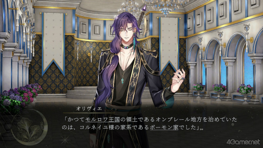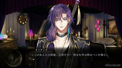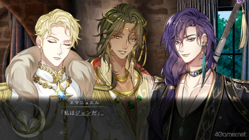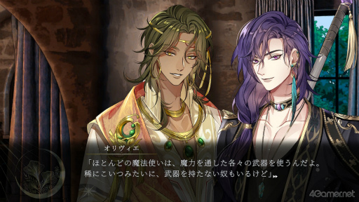 本作の攻略対象キャラクターは4人。最強の魔法使いであるオリヴィエ(CV:興津和幸),貴族で内政官のエマニュエル(CV:梅原裕一郎),騎士で吟遊詩人のメロディー(CV:鈴木達央),魔法医術師のイスマイール(CV:矢本颯真)だ。