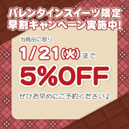 さらにバレンタインスイーツ限定早割キャンペーンも実施中! 1月21日(火)までに予約すると5%OFFに♪ ぜひお早めにご予約ください!