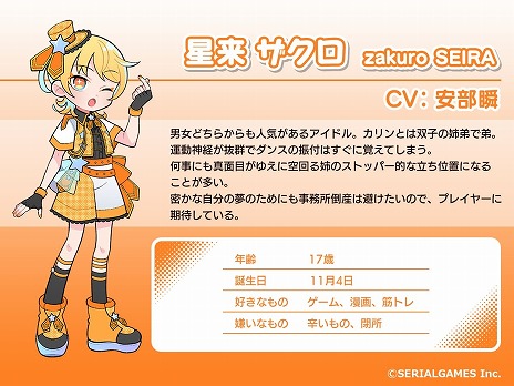 星来ザクロ(CV:安部 瞬) に応援されながら,ファンのハートを掴むべく奮闘する。