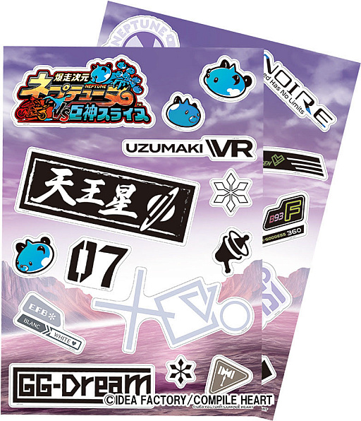 『爆走次元ネプテューヌ VS巨神スライヌ』のゲーム中に登場するバイクに貼り付けられているステッカーなどを再現した2枚組のステッカーセットです。