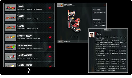 同サイトには,2004年に稼働を開始した初代から,2024年4月に稼働を開始した最新作「湾岸ミッドナイト マキシマムチューン 6RR PLUS」までの情報を網羅した「HISTORY」コーナーや,作曲家の古代祐三氏や開発チームら関係者からの「MESSAGE」コーナー(※)など,さまざまなコンテンツが掲載されている。