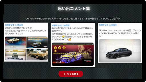これを記念し、これまでの歴史を振り返る「HISTORY」コーナー、プレイヤーの皆様のSNS投稿を集めた「思い出コメント集」、20周年イヤーに関連する「NEWS」などのコンテンツとともに、湾岸マキシの今までとこれからに触れる、シリーズ20周年記念サイトをオープンいたしました。※後日、英語と中国語の言語対応をおこなう予定です。