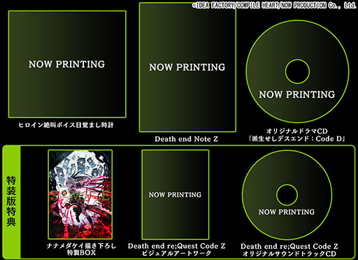 また,通常版に加えて,特装版とデジタルデラックス版,Death end BOXも用意される。価格は順に各1万780円,1万6280円。前者にはビジュアルアートブックやサントラが,後者には,ヒロインの絶叫ボイスを収録した目覚まし時計やオリジナルドラマCDが同梱されるという。