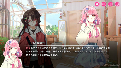 本作でプレイヤーの分身となるのは,未来の神作家,伊香詩子。彼女はひょんなことからオタバレし,自分が楽しむためだけにしたためていた推しカプ小説をクラスメートの海月結良に見られてしまう。