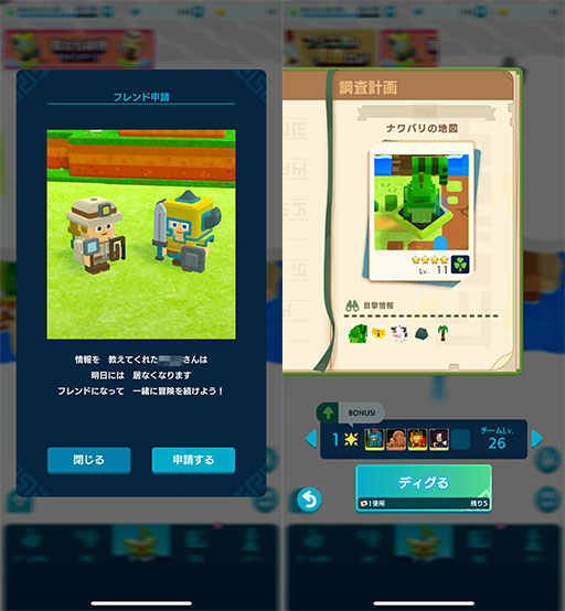 さらに,マップには別のプレイヤーも存在しており,彼らをタップすることでクエストをシェアしてもらえたり,フレンド申請ができたりする。今回は先行プレイだったのでプレイヤーの総数が多くなかったが,本リリース後にはMMO的なワイワイ感を楽しめそうな要素だ。