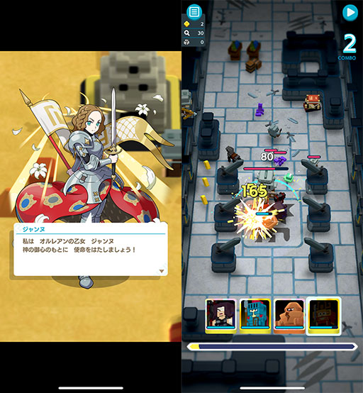 ステージは縦スクロールのアクションゲーム形式で,タップで移動先を決めるだけで近くの敵と自動で戦闘を行ってくれる。MOBAに近い操作感で,アクションが苦手な人でも問題なく楽しめる。