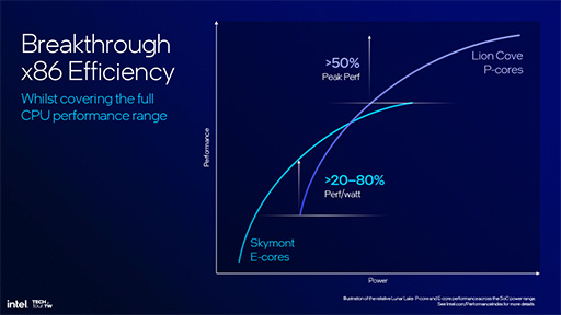 Meteor Lakeでは,E-coreよりもさらに低消費電力の「LP E-core」が2基あったが,Lunar Lakeでは搭載していないのもポイントだ。Intelによると,Lunar Lakeは,さらに電力効率を重視した設計で,LP E-coreの役割をE-coreでカバーできるため,省略したとのこと。さらに設計の単純化とダイ面積の縮小というメリットもある。
