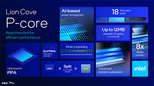 Lion Coveは,AIを利用した電力管理機能を備えているのも見どころだ。実行されているワークロードとCPU温度を検知して,CPUに供給する電力を厳密に管理するという。また,従来のIntel製CPUでは,100MHz単位のクロック制御であったのに対して,Lion Coveでは,16.67MHz単位という細かな制御が可能となった。これにより,CPUに設定された限界近くまで,クロックを引き上げられるという。
