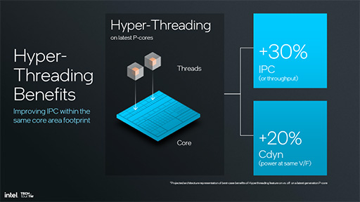 また,Lunar Lakeでは,Intel製CPUで長年採用していた「Hyper-Threading」に対応しない点も見どころである。Hyper-Threadingは,1つのCPUコア上で2つのスレッドを並行して処理する仕組みだ。Intelによると,Hyper-Threadingを有効化することで,IPCが30%向上するメリットがある一方で,スレッドやプロセス管理,セキュリティ対策などで,回路規模と消費電力が増えてしまうデメリットもある。