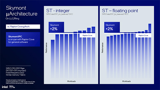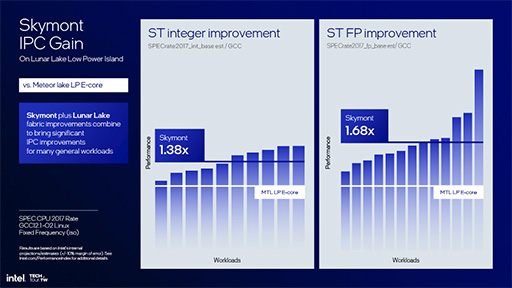 E-coreのSkymontも,実行ユニットの増量といった強化が加えられている。Meteor LakeのLP E-coreと比べて,シングルスレッドの浮動小数点演算性能は38%,マルチスレッドでの整数演算性能は68%向上した。また,先述したように,E-coreのみでも従来よりも幅広いワークロードに対応できるのも見どころとなっている。