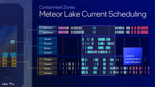 また,OSに対してCPUコアの状況を通知して,処理の割り振りを行う「Thread Director」も改良されている。Meteor Lakeでは,まずLP E-coreに処理を割り振り,賄えない分をE-coreやP-coreに移していた。ただ,LP E-coreは2コアしかなく,性能も高くないので,結局はE-coreとP-coreで,処理することが多くなる。
