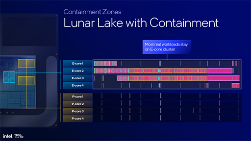 Luna Lakeも基本的には,E-coreを優先的に使って,溢れた分をP-coreで処理する方針に変更はない。ただし,Luna LakeのE-coreクラスタは比較的大きく性能も高いので,E-coreだけで多くのアプリケーションを処理できるようになった。