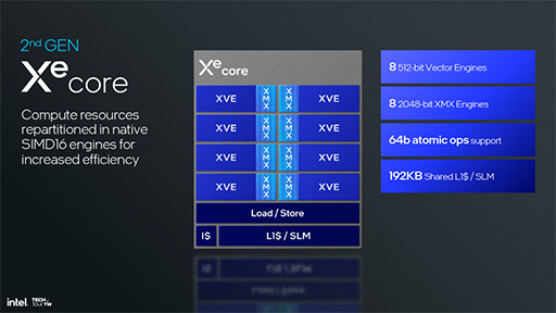 Xe2は,ベクタ演算器である「Vector Engine」と,AI処理を行う「XMX Engine」を8基備える。これに加えて,ロードストアユニットとL1キャッシュをまとめて「Xe Core」を構成する。Vector Engineが,SIMD16命令に対応したことで,演算処理の効率が上がったという。