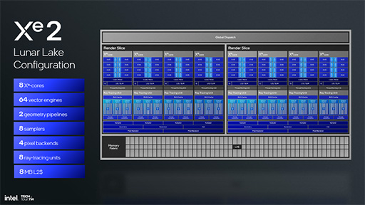 Xe2には,強化されたXe2と,レイトレーシングユニットである「RTU」も4基備える。Xe CoreとRTUに,サンプラーやジオメトリエンジン,ラスタライザーなどを組み合わせたのが「Render Slice」だ。Lunar Lakeの統合GPUは,このRender Sliceを2つ搭載している。