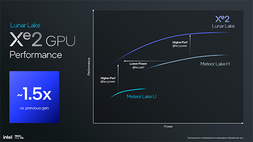 Intelによると,Meteor Lakeの統合GPUと比較して,性能が最大1.5倍に向上したという。また,高性能版のMeteor Lake-Hプロセッサと,低電力版のMeteor Lake-Uという2つのプロセッサでカバーしていた用途を,Lunar Lakeでは1種類のプロセッサでカバーできるのもポイントだ。