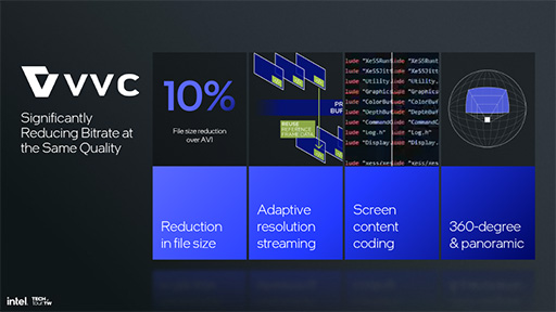 H.266/VVCは,普及し始めた「AV1」コーデックと比べて,ファイルサイズを抑えられるとのこと。また,帯域幅に合わせて再生中している動画の解像度をシームレスに変更する「Adaptive Resolution Steam」や,360度全周動画のデコードなどに対応するのも特徴となっている。