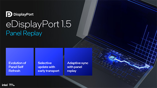 Panel Self Refreshは,PCがスタンバイ状態でも直前に表示した映像をメモリに記録しておける仕組みだ。PCの状態に変化があるまで,低電力で映像表示をそのまま維持できる。また,eDP 1.5で新たに加わった「Panel Replay」機能は,映像で変化があった部分だけ更新するというもので,これも電力消費の削減に寄与するという。