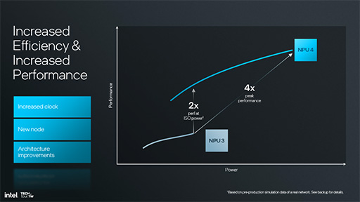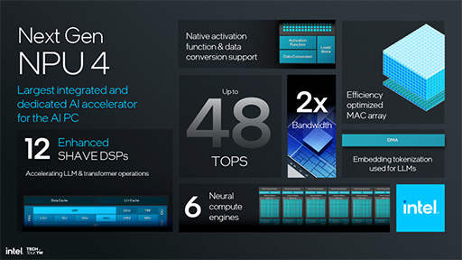 Meteor Lakeから継続して搭載するNPUは,第4世代に進化した。行列計算を行う演算器「MAC Array」の数を3倍に増量。加えて,センサーや画像の処理に利用する「SHAVE DSP」の動作周波数も引き上げた。これにより,NPUの演算性能は,Meteor Lakeの11 TOPSから,48 TOPSに向上したという。