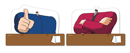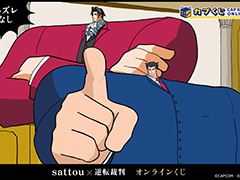 くじでは,成歩堂龍一,御剣怜侍,王泥喜法介などおなじみのキャラクターたちの賞品が登場。いつもの法廷の背景,いつものポーズのキャラクターたちがsattou氏によって描かれている。ただ,どのキャラクターももれなく肩幅がでかい。