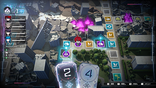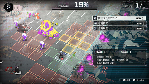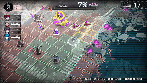 画面左上の数値が「AP」で,この回数だけ行動させられる。全員共有のリソースなので「APより学生の数が多い」なんてことも起こり,1ターンに全員が行動できるとは限らない。怠美も通常なら広範囲に移動しつつ攻撃できるが……