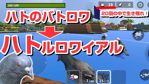 ユーザーが鳩を操ることが出来るバトルロワイアルゲームで20人が飛行機からマップに飛び降り、武器やアイテムを広い戦い最後まで生き残ったユーザーが勝利というルールです。鳩は口から豆を発射したりクチバシでつついて攻撃することが出来ます。