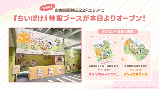 2024年7月20日(土)から8月25日(日)に開催のフジテレビジョン主催のイベント「お台場冒険王 2024〜人気者にアイ♡LAND〜」にて展開中の「ちいかわアドベンチャー」横に『ちいぽけ』のブースが登場いたします。本ブースでは、公式Xをフォローした画面のご提示で「ちいぽけオリジナルステッカー」を、アプリ事前登録画面のご提示で「ちいぽけオリジナルうちわ」をそれぞれプレゼントいたします。