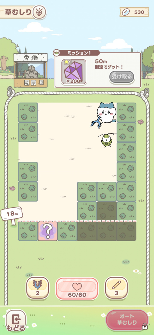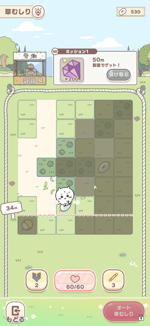 画面下中央のハートマーク(「げんき」)を選択すると,ちいかわが登場し,タップしたブロックを1マス除去してくれる。濃い草(画像内の濃い緑のブロック)は「げんき」を2つ消費するが,「げんき」は時間経過で回復する。さらに,「草むしり」を進めると,「げんき」を複数消費することで「オート草むしり」が開放され,自動で草を除去できるようになる。