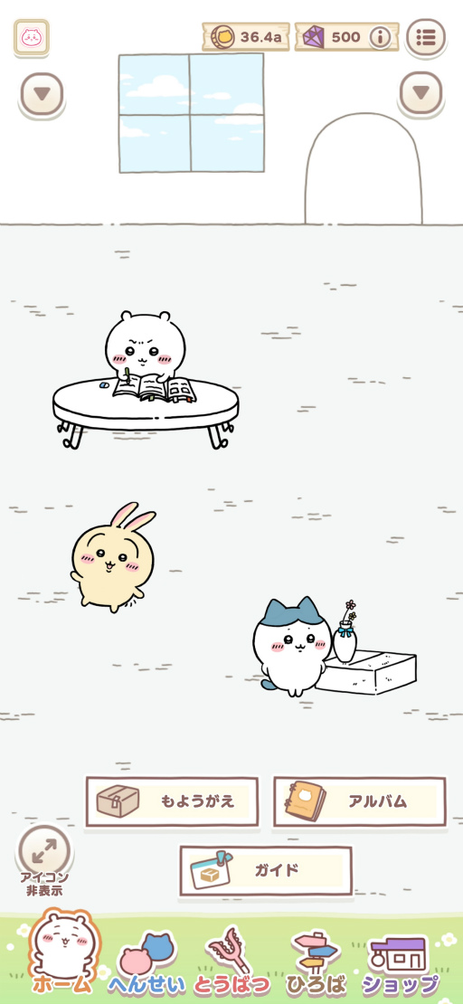 ホームにホームアイテムを配置すると,そのアイテムに対応したキャラクターが登場する(登場や動きはランダム)。