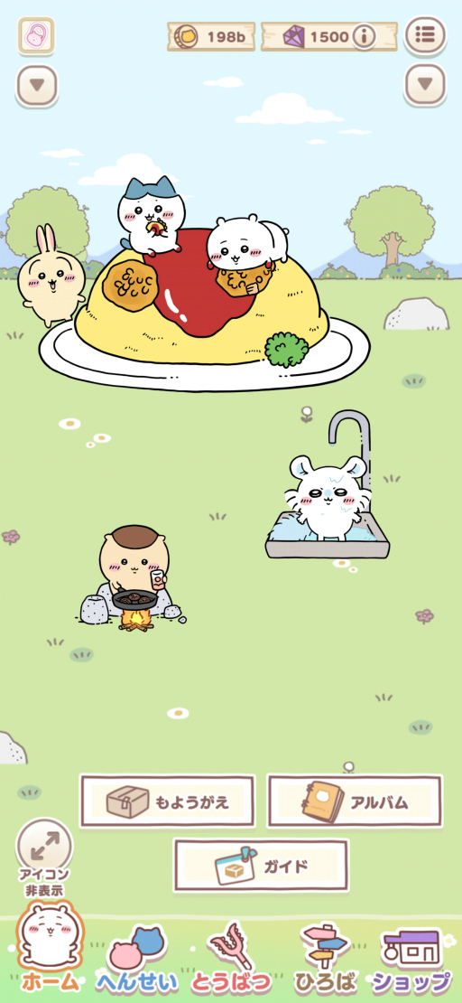 本作の流れをまとめると,【まずは「討伐」! → 合わせて「草むしり」や「むちゃうまフェス」でキャラを強化し,アイテムを獲得しながら「ホーム」のもようがえや,ちいかわの衣装を楽しむ】というイメージだ。