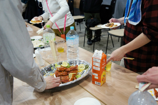 レッスンのあとは,参加者同士の懇談タイムが設けられた。テーブルには,ドリンクや筋肉に良い作用がありそうな肉系の軽食が用意され,運動後のタンパク質摂取もバッチリである。