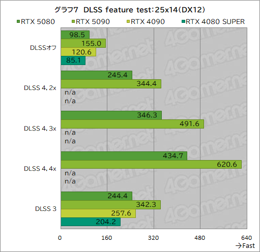 グラフ6,7はNVIDIA DLSS feature testの結果だが,RTX 5090がそうであったように,RTX 5080もMulti Frame Generationの効果がハッキリと表れている。なお,RTX 4090とRTX 4080 SUPERはDLSS 4に対応しないので,DLSS 4のスコアはない。