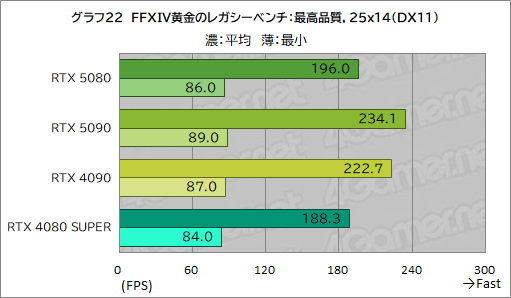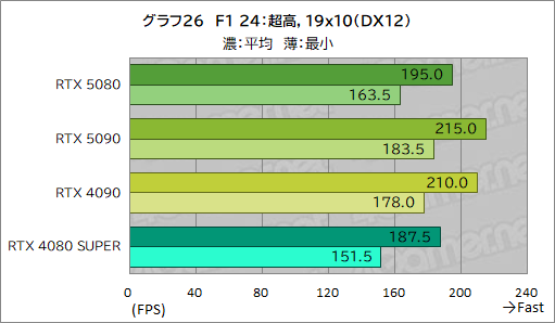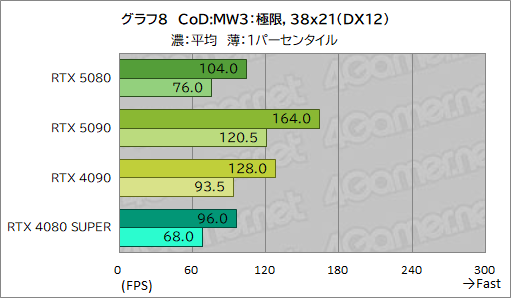 平均フレームレートは,総合スコアを踏襲したものとなっているが,最小フレームレートは,CPU性能の影響が色濃く表れるため,あまり差が付いていない。それでもRTX 5080は,RTX 4080 SUPERに10fps近くの差を付けている点は評価できよう。