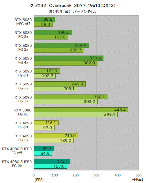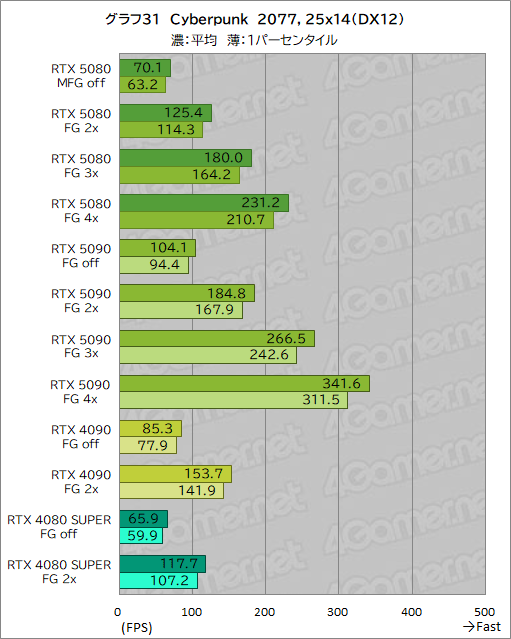 さて,今回のゲームで唯一,DLSS 4に対応するCyberpunk 2077で,マルチフレーム生成の効果をRTX 5080でも確かめてみよう。グラフ30〜32が,その結果だが,文中とグラフ中ともに,DLSS Multi Frame Generationのフレーム生成倍率を,「RTX 5090 FG 4x」といった具合に,FGの後ろに数字で示している。