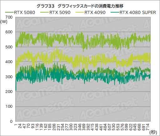 いつものように,NVIDIAが開発した消費電力計測ツール「PCAT」(Power Capture Analysis Tool)を用いて,グラフィックスカード自体の消費電力を計測してみたい。なお,テストは,RTX 5090のレビューと同様に,3DMarkのTime Spy Extremeにおいて,消費電力が高くなる傾向がでたGraphics test 2実行中に行っている。その結果をグラフ33に示そう。