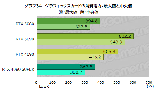 ここではピーク値を結果として採用するため,どうしても差が大きい傾向が出てしまう。それ踏まえて見ていくと,各ゲーム実行時においてRTX 5080は,700W前後の消費電力となった。これはRTX 5090よりも186〜345W程度低いが,RTX 4080 SUPERよりは5〜70W程度高くなっている。RTX 5080の消費電力は,TGPどおりRTX 4080 SUPERから40Wほど増えた,という理解で問題なさそうだ。
