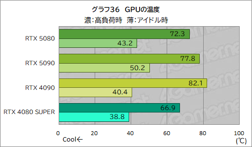RTX 5080は,高負荷時でも70℃台前半に収まっており,GPUクーラーは,しかりと冷却できている。アイドル時にRTX 4090やRTX 4080 SUPERより高めになるのは,GPUクーラーが2スロット厚となり,アイドル時はファンの回転が止まるので,放熱フィンの面積が減ってしまったことが影響したのだろう。