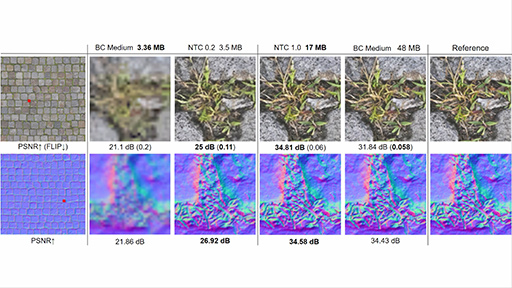 上側はアルベド(拡散反射)テクスチャで,下側は法線ベクトルテクスチャ(法線マップ)だ。右端の「Reference」は無圧縮画像で,「BC〜」はDirectXで標準的なテクスチャ圧縮方式を用いて圧縮した例。「NTC〜」がニューラルテクスチャ圧縮の例だ。dB値は画質を表し,高い値ほど画質が良い。それぞれの方式で圧縮した画像から,近い容量同士で画質を比較すれば,ニューラルテクスチャ圧縮の品質の高さは一目瞭然だ。
