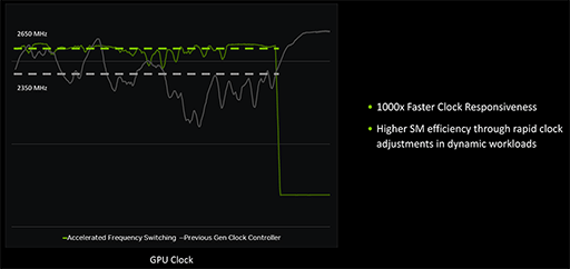 さらにBlackwellでは,たとえGPUが描画中であっても,GPU負荷に応じて動作クロックを上下させる制御も行っている。これはAda世代までは,行っていなかった制御だ。NVIDIAによれば,動作クロックの上下制御による遅延は,Ada世代までの1000分の1にまで短縮できたので,導入したという。
