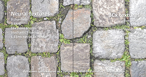 多様なスペックのPCを持つユーザーのために,複数の解像度でテクスチャを持つのではない。ひとつだけのニューラルテクスチャをゲームパッケージに持たせて,インストール時にユーザー環境ごとにテクスチャデータを展開する方式になるのだろうか。