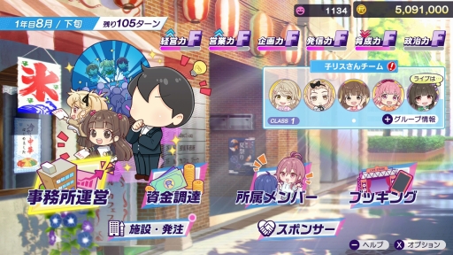 経営力から政治力まで,6項目ある事務所のパラメータはまだ最低ランクだ。子リスさんチームのメンバーたちも,ヨワヨワで頼りない事務所では不安になってしまうだろう。