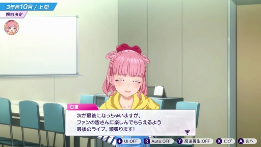 解散,そしてラストライブのことを告げると,陽本日夏は目に涙を溜めながらも笑顔を作る。胸が痛む
