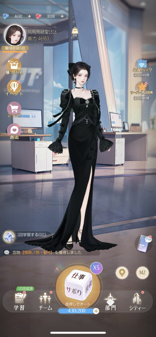 “私”の活躍の場は職場だけに留まらない。旅行に行ったり,自宅でくつろいだりしているときにもサイコロを振って自分を磨いていこう。サイコロを振るアクションはオートにできるため,ずっとタップし続けなくてもいいのは便利だ。
