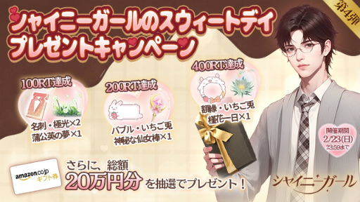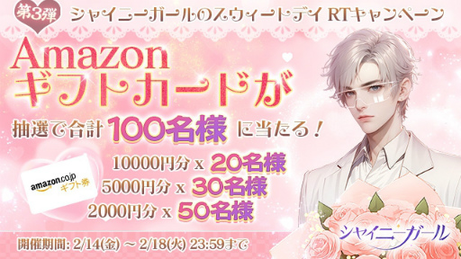 公式Xでは,「シャイニーガールのスウィートデイ・100万円企画」の第3弾「RPキャンペーン」が開催される。抽選で総額45万円分のAmazonギフト券を合計100名にプレゼントするとのこと。バレンタインという特別な日に,チョコレートよりも甘い甘い思い出を作ろう!![]() |