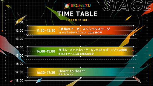 本イベントでは,「『戦場のフーガ』スペシャルステージ in ハピネットゲームフェス!2025 春の陣」「月刊ムー×ハピネットゲームフェス!×ゴー☆ジャス動画 オカルトゲームに潜む悪魔を祓う」「Heart to Heart 提供:ToHeart」が開催される。それぞれの実施内容をいかにお伝えしていこう。