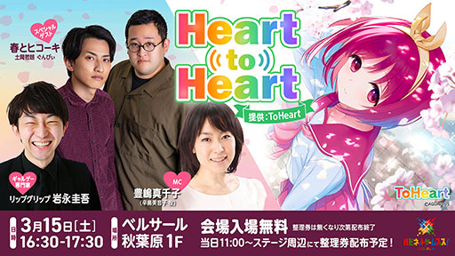 最後のHeart to Heart 提供:ToHeartは,「ToHeart」が令和に復活することを記念して行われるもの。ステージには声優の豊嶋真千子さん(辛島美音子役),お笑いコンビ「リップグリップ」のメンバーでギャルゲー専門家の岩永圭吾さん,「春とヒコーキ」の土岡哲朗さん,ぐんぴぃさんを招き,楽しいステージを届けるとしている。