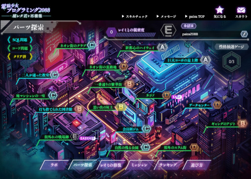 この画面から、プログラミング問題に挑戦する「パーツ探索」や、キャラクターの見た目の変更ができる「レイミの修復」を選択できます。