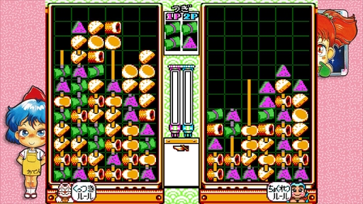 「くにおのおでん」はテクノスジャパンには珍しい落ちものパズルで,おでんの具が落ちてくる。同じ具を隣接させる「くっつき」と,縦横斜めにそろえる「ちょくれつ」のルールを選べる変わり種だ