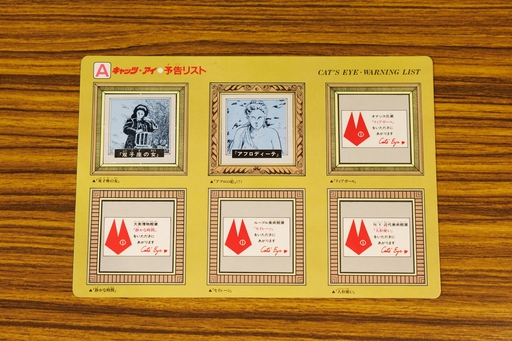 ということで,まずはファーストゲーム,喫茶「キャッツ・アイ」店内からスタート。開始にあたり,プレイヤーには「キャッツ・アイ予告リスト」(キャッツカード)が配られます。そこにはそれぞれ今回盗まなくてはならない6点の絵画のリストが書かれているので,その情報収集が目的となります。