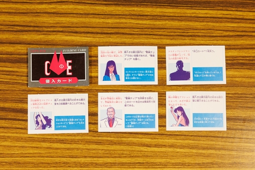 ようやく館内に潜入。ここでまた1枚,今度は「潜入カード」を引きます。ここまで読み進めた方ならうすうす感じているかもしれませんが,このゲーム,とにかくカードの種類が多い。制作者のこだわりとも受け取れますが,それにしてもちょっと多すぎ……。ですがこれこそが昭和のレトロボードゲーム。ちょっと詰め込み過ぎぐらいなところが,いまどきのスマートなボードゲームにはない,昭和らしい偏ったバランスを感じて愛おしいです。