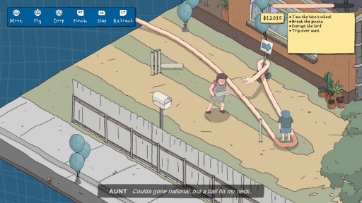 ゲームのコンセプトは非常にシンプルだ。プレイヤーは主人公である窃盗犯の“伸びる腕”を操作し,画面右上に指定された品々を盗み出していく。伸びる腕の手の甲をマウスクリックで摘まみ上げるようにして動かしていくのだが,これがなかなか難しい。手すりや柱,自動車などの障害物があると,思ってもみなかったところに手が通ってしまい,マップのあちこちで長く伸びた腕がぐちゃぐちゃに絡まってしまう。2Dグラフィックスということもあって,方向が上手く定まらないチャレンジングな物理仕様になっている印象だ。